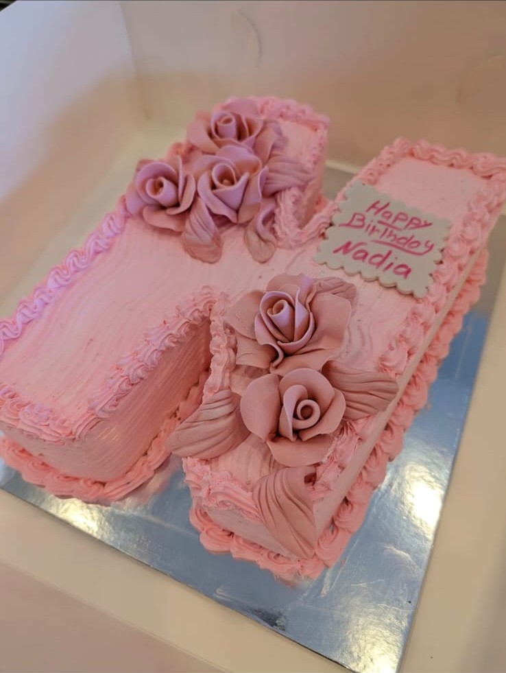 A number shaped cake in soft colourful tones, decorated with delicate roses and a custom message. Designed for stylish celebrations.